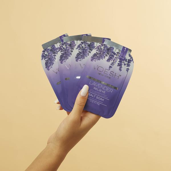 Relax and experience deluxe with our Lavender Relieve Pedi in a Box 4 Step This all-in-one spa pedicure kit is infused with natural lavender extract to drift you away to dreamland for an ultimate relaxation experience. Keep calm and pedi on. Indulge in some me-time and pamper your feet with our Lavender Relieve pedicure! Infused with natural lavender extract, this foot treatment soothes and calms skin, leaving it soft, supple and comfortable. Plus, the invigorating sweet and floral scent of Lavender will send you off into total bliss!